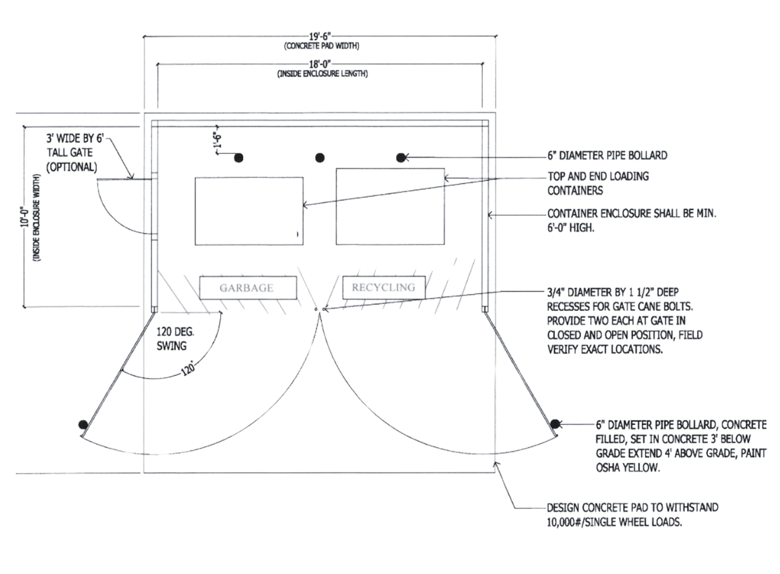 Outdoor Enclosures: Outdoor enclosures for recycling and garbage dumpsters help keep areas orderly and prevent illegal dumping and contamination. When planning outdoor enclosure areas, always account for their precise dimensions as well as clearance to access all sides of each dumpster.