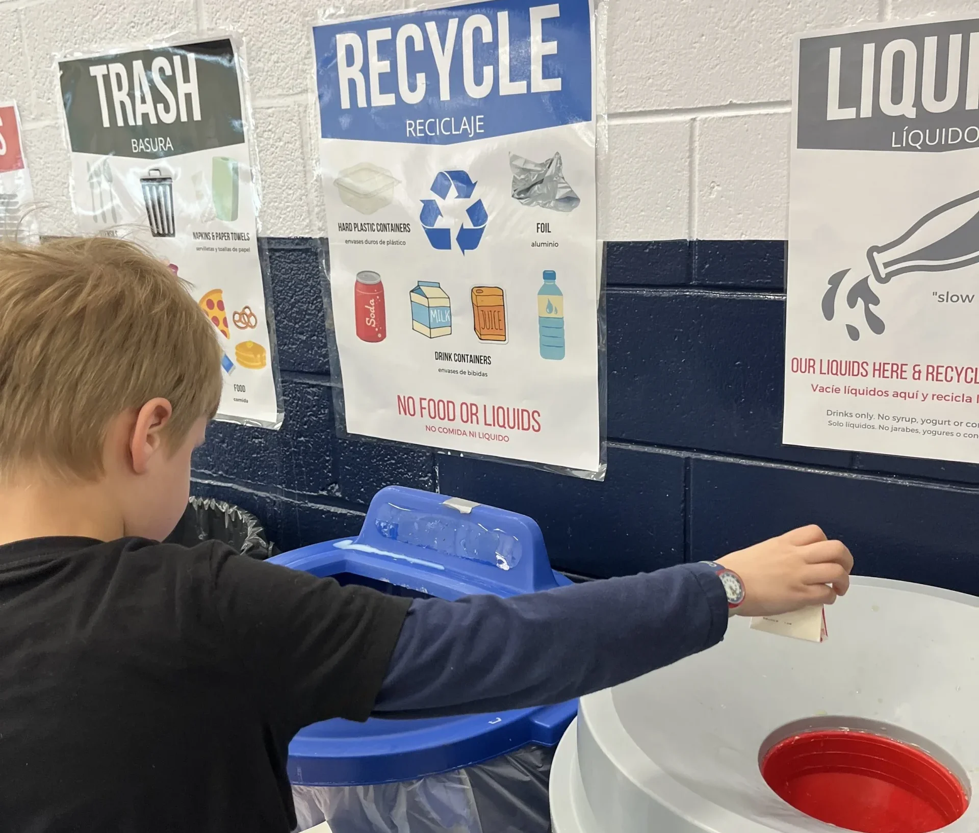 Liquids Container: All containers must be emptied of food and liquids before recycling. Provide a station where students can pour out leftover liquids before recycling bottles, cans, or cartons.